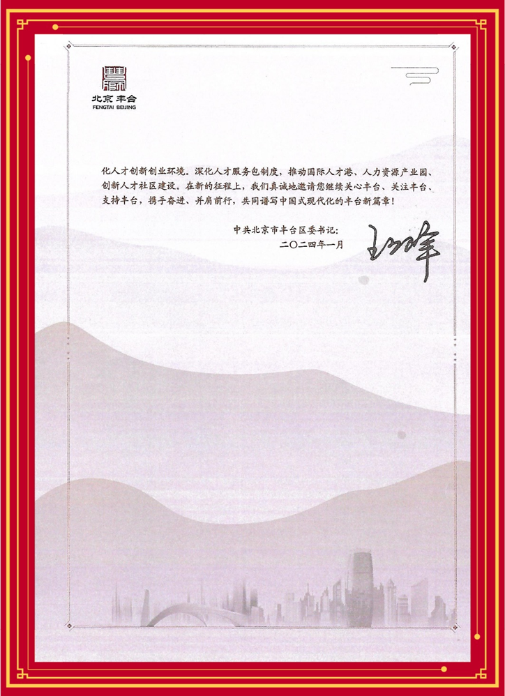 王少峰书记在繁忙的政务工作中,仍然不忘致信企业,展现出书记对人才工作的重视和企业成长的关怀。书记在信中提到,在刚刚召开的区委十三届七次全会上,丰台区将加大创新人才引培力度,持续实施“丰泽计划”“慧聚英才·筑梦丰台”等人才引进储备措施,深化“学子回家”品牌,加快高层次人才集聚和青年人才培养储备推动人才发展与产业发展深度融合,面向海内外引进高端科创人才,持续优化人才创新创业环境等一系列人才政策。