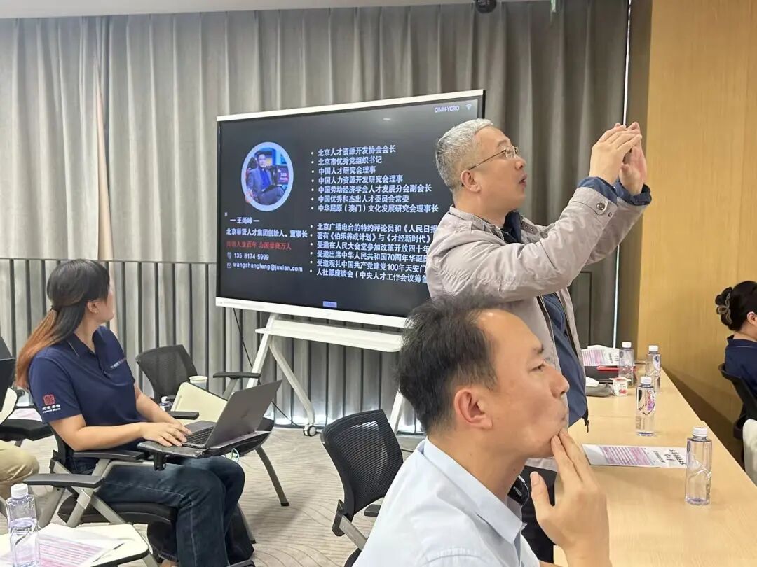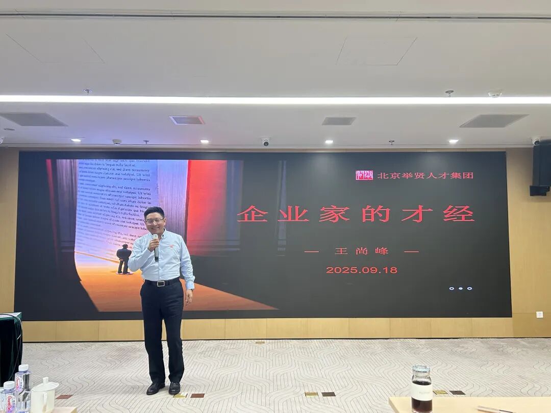 9月18日,“北京未来企业家实训营”(首期)常态化实训第五课在中关村科技园区丰台园成功举办。本次实训以“丰聚英才,企航未来”为主题,由中共丰台区委、丰台区人民政府主办,丰台区委组织部(区人才局)、区委统战部、区工商联承办,北京大学校友会、北京大学创新创业学院提供战略支持,北京大学创业训练营担任学术指导,招商银行北京分行提供资源支持。北京举贤人才集团董事长王尚峰先生受丰台区人民政府邀请,为现场百余位企业家带来《企业家的才经》专题讲座。会场座无虚席,企业家们专注聆听,不时低头记录。