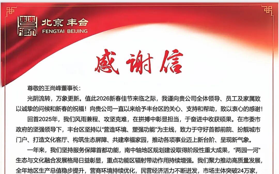 春潮涌动处,奋进正当时。2026年新春佳节之际,举贤人才集团再次收到一份沉甸甸的荣誉:中共北京市丰台区委书记王少峰亲笔签名的《感谢信》。这已是举贤连续第四年斩获丰台区政府的官方肯定,一封书信不仅承载着政企同心的深厚情谊,更彰显了举贤作为“政府猎头领先者”的专业实力与行业担当。作为国内高端人力资源服务的标杆企业,举贤集团能连续四年获得政府高度认可,源于其深耕行业18年的扎实积淀与“为国举贤”的使命坚守。