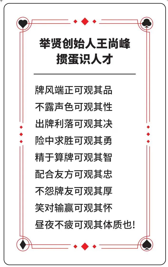 小编在此先代表举贤感谢大家对于“掼蛋识人才”方法论的“厚爱”,同时也借着这个机会和各位好好聊一下掼蛋和人才的关系以及王尚峰董事长的创作历程。
